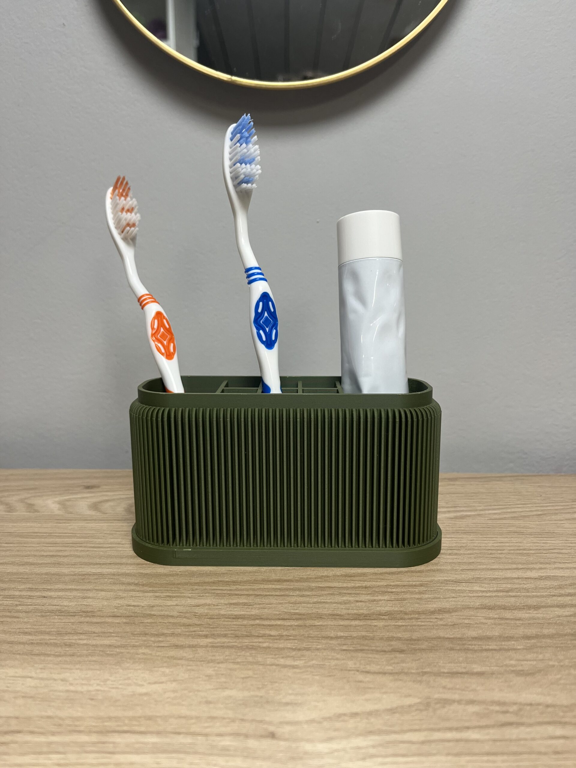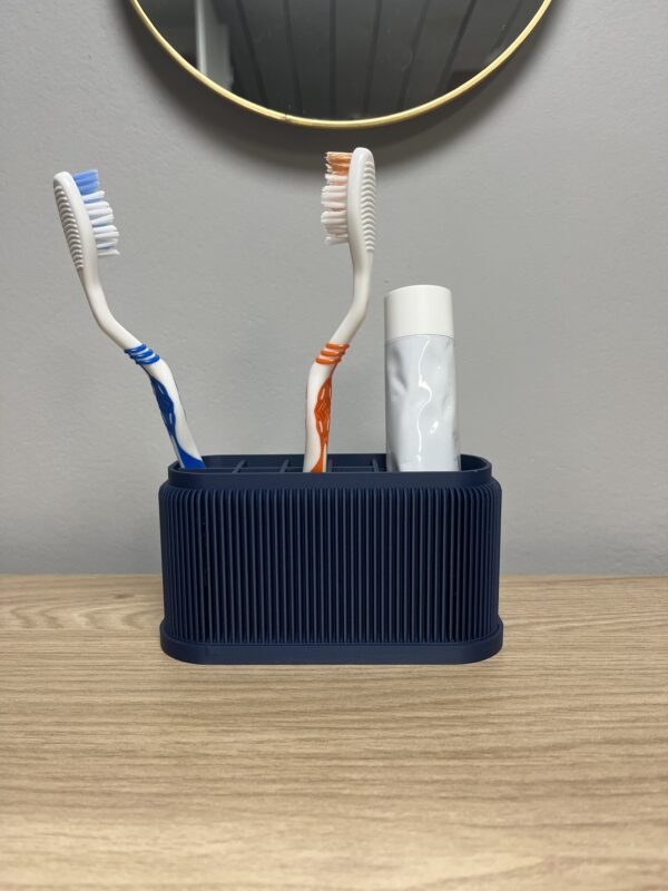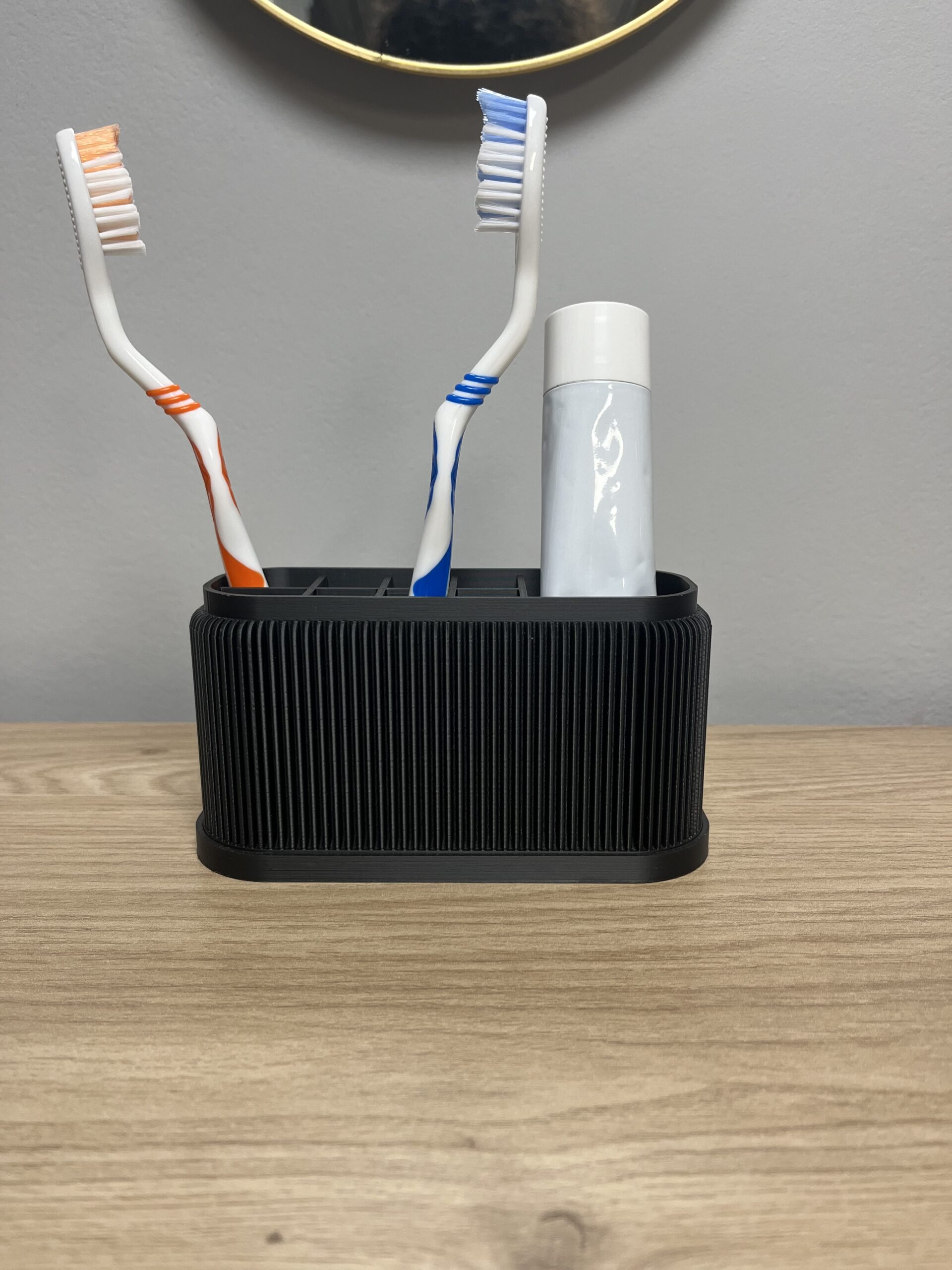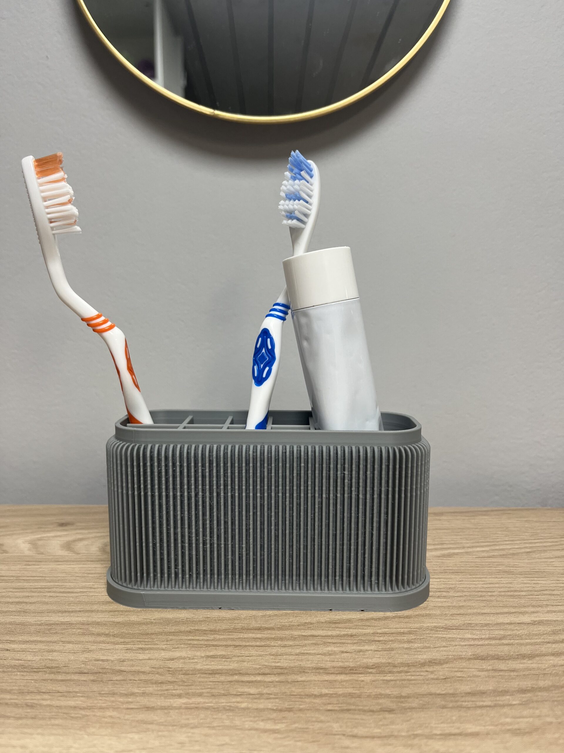 Son rangement intégré accueille jusqu’à 5 brosses à dents et 1 dentifrice, le tout dans un design strié moderne, conçu et fabriqué dans notre atelier à Angers.