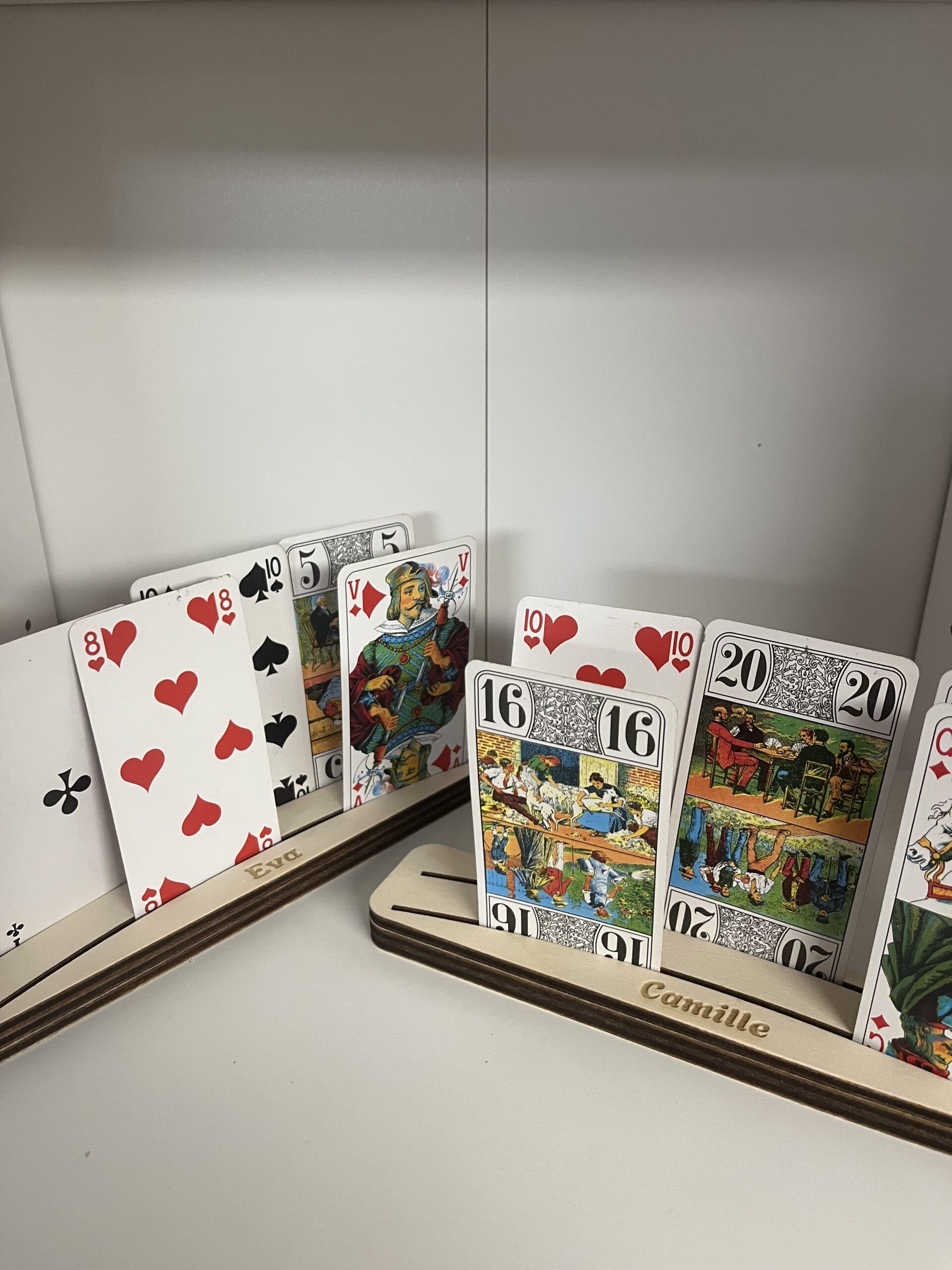Le porte-carte en bois personnalisé est l’accessoire idéal pour organiser et mettre en valeur vos cartes du quotidien. Grâce à ses deux rainures creusées directement dans le bois, il permet de disposer facilement des cartes classiques, cartes de visite ou cartes de tarot, en deux rangées distinctes.
